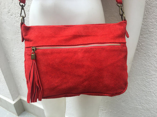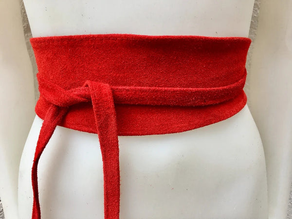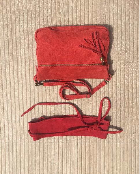 Suede leather bag in RED with matching obi belt. Both garments are made of soft natural suede leather.