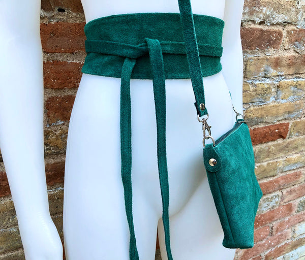 Small suede leather bag and matching OBI belt in teal GREEN. Natural, soft genuine suede leather in a beautiful dark blue-GREEN shade .Small cross body bag in suede. BOHO, Festival cross over bag. Adjustable and removable suede strap. Can be worn as a shoulder bag or cross body.