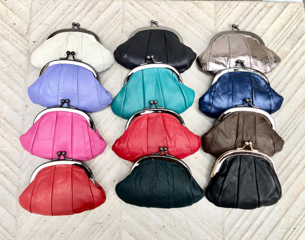 Kiss lock coin purse in soft leather with metallic frame in SILVER. Small clip purse in GENUINE leather. Retro inspired SMALL clip pouch . Lined in a strong nylon fabric. Clip clasp in gold color metal. Vintage , grandma style new purse.