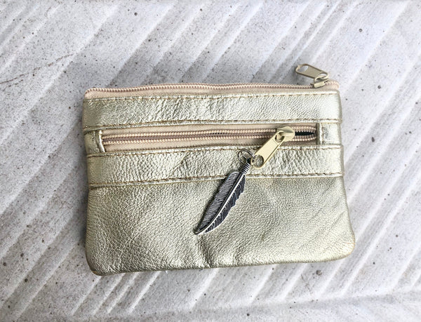 Large enough to fit regular credit cards. Metallic feather charm attached to one of the zippers.