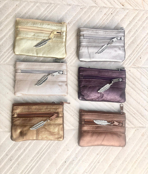 Small purse in metallic shine genuine leather, 3 zippers. Fits credit cards, coins, bills. Small leather wallet.Gold, silver, copper, purple