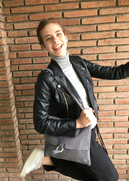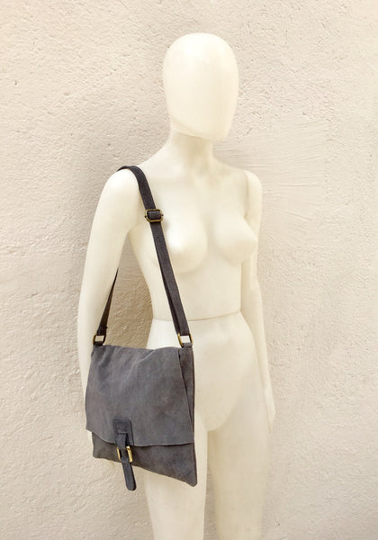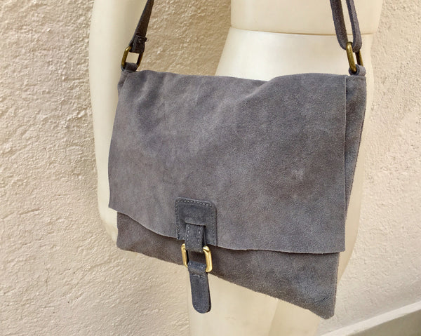 GREY leather bag. Messenger bag with adjustable genuine suede leather straps, closed by zipper and flap.