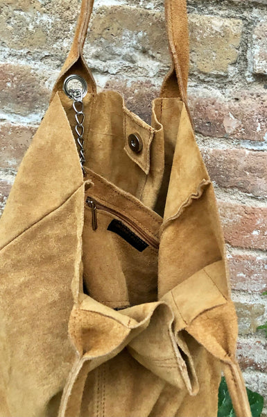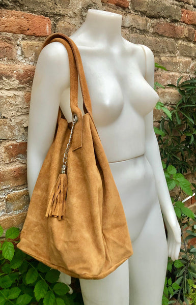 Suede shopper bag. Large tote leather bag in saddle brown. Camel brown carry all bag made with natural genuine suede leather. This comfortable boho bag in tan color is large enough to fit most laptops, tablets, books etc. This laptop or book bag is NOT LINED. We added a small leather zipper pouch for your mobile phone and/or cards or money. It ist attached to the inside of the bag by a metal chain.