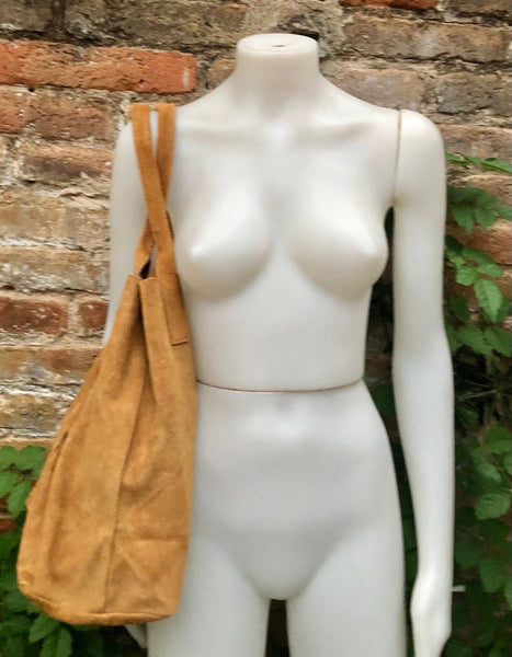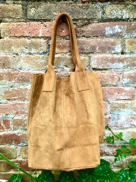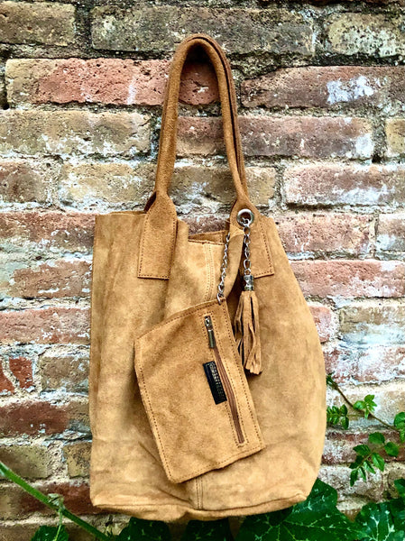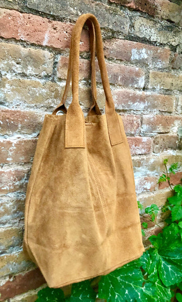 Camel brown leather shopper bag in genuine suede. Slouchy saddle brown carry all tote bag for laptops, tablets, books. Brown leather purse