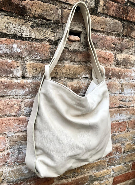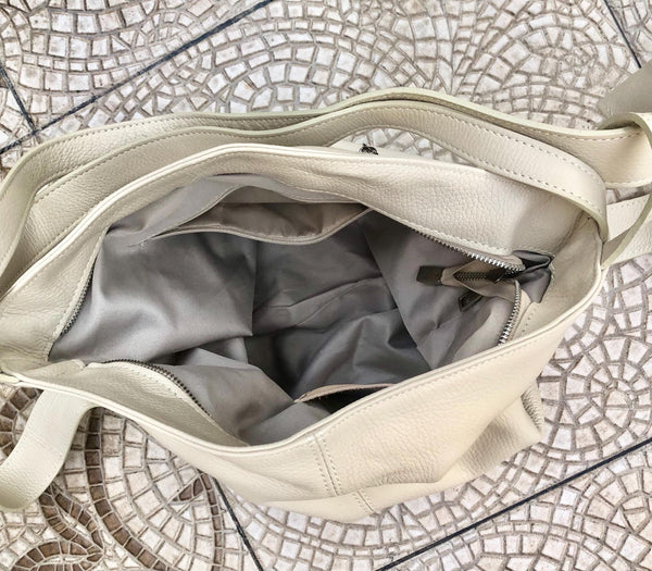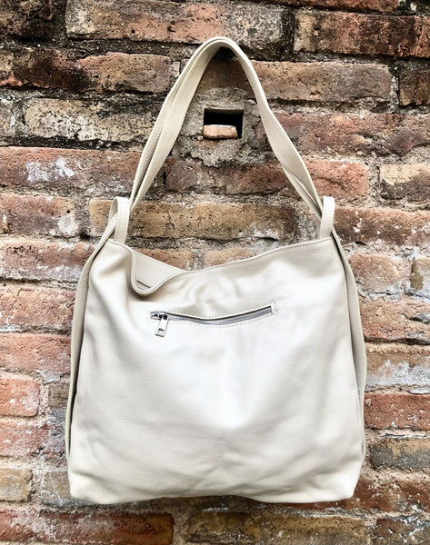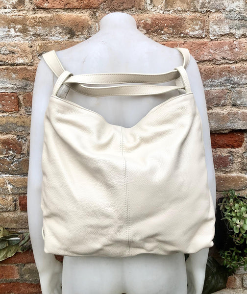 Genuine leather backpack/rucksack/ shoulder bag in cream color. Zipper closed large tote leather bag in GENUINE leather. Tablet, Ipad or laptop bag.