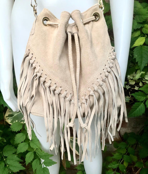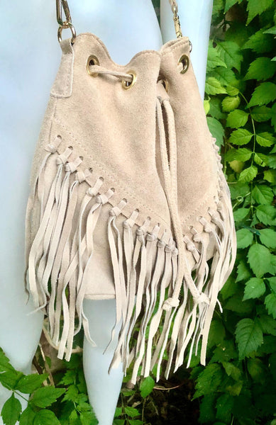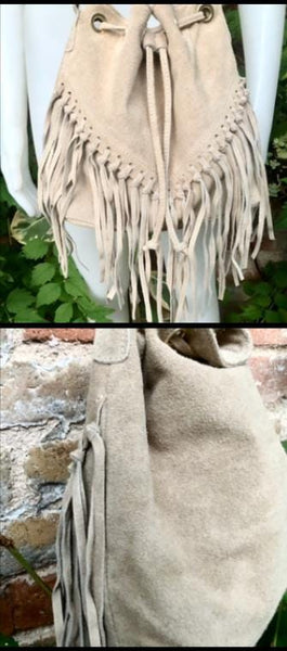 Beige suede fringed bag. Crossbody or shoulder hippy bag in suede leather with long fringes. Beige boho bag . Natural genuine suede leather. Drawstring at the top, can also be worn with the drawstring lose.