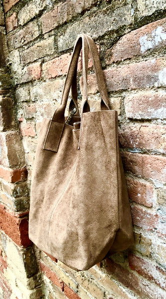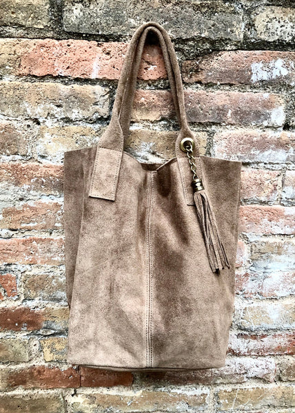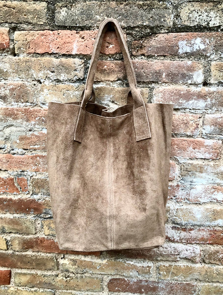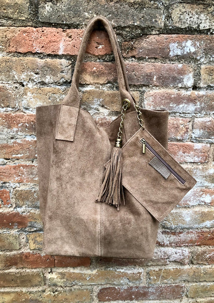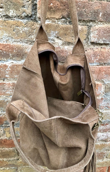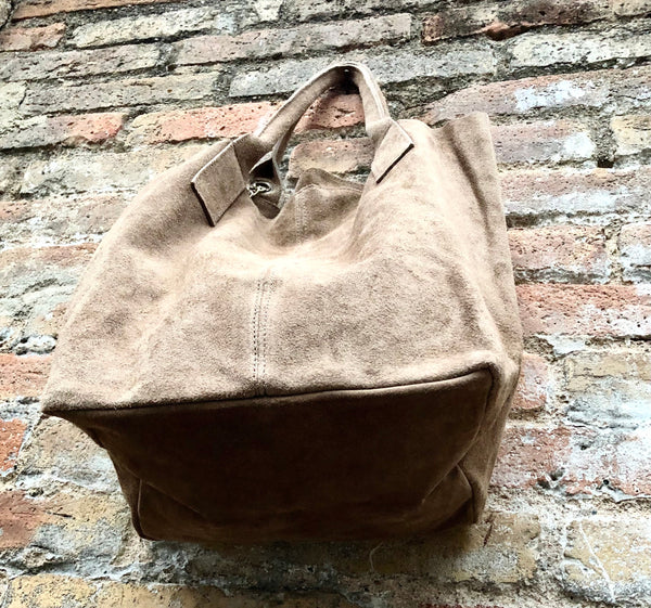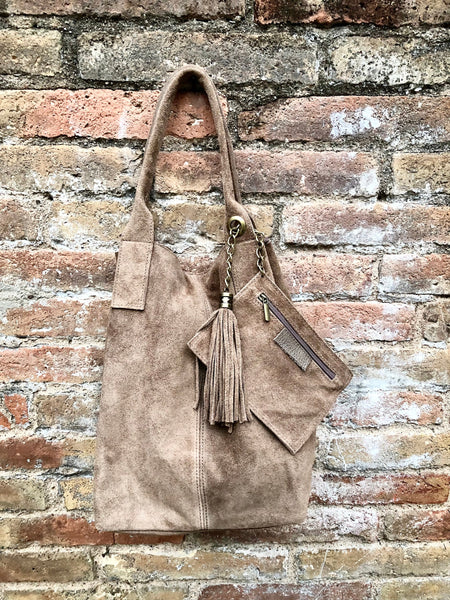 Suede shopper bag. LARGE tote leather bag in light brown. Carry all bag made with natural genuine suede leather. This comfortable boho bag in tan color is large enough to fit most laptops, tablets, books etc. Closed by a magnetic clip at the center. This laptop or book bag is NOT LINED. We added a small leather zipper pouch for your mobile phone and/or cards or money. It ist attached to the inside of the bag by a metal chain.