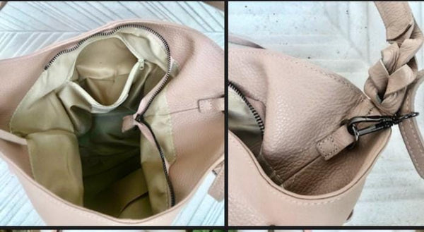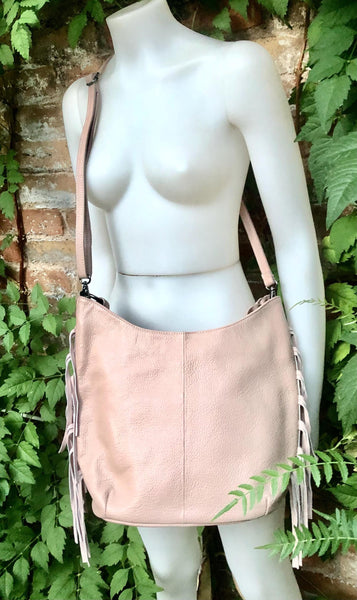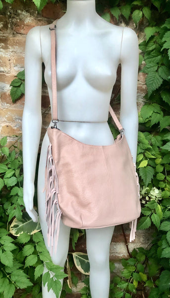 Pink crossbody / shoulder bag in genuuine leather with fringes. Light dusty pink boho bag . Natural genuine leather purse. Hippy bag with fringes.