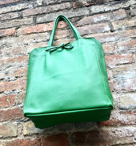Large tote leather bag in GREEN. Leather shopper in Green closed by a zipper at the top. Large enough for laptops, tablets, books etc. Natural GENUINE leather.