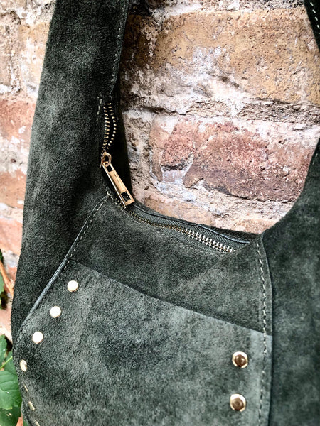 Slouch bag in dark green suede with tacks. Soft leather shopper. LARGE tote leather bag in DARK GREEN with zipper. Natural genuine SUEDE leather. LINED. Dark green carry all bag with wide strap.