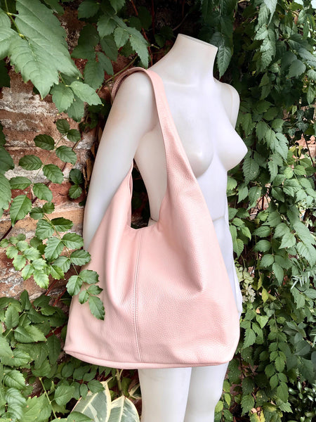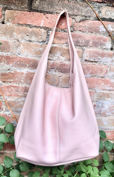 Tote leather bag in light pink with zipper. Natural genuine leather. NOT LINED. This style is closed with a zipper. Dark khaki green leather shopper.