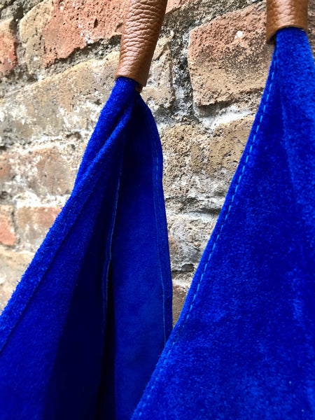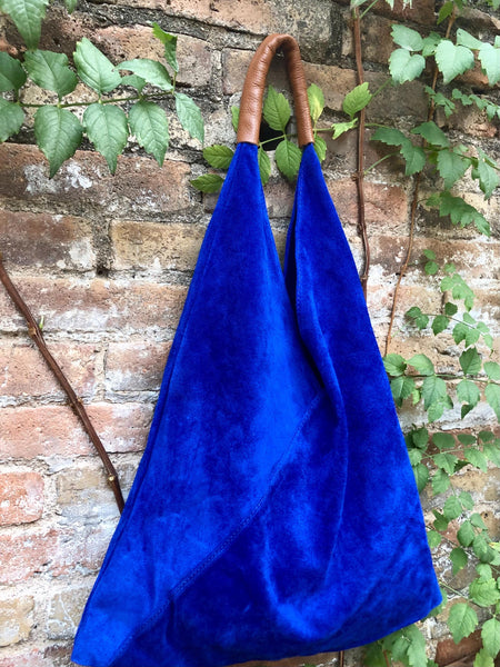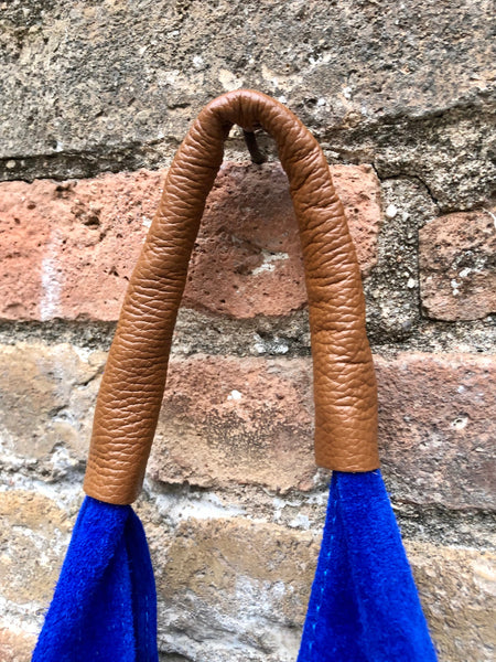 Origami style genuine suede leather bag in cobalt blue with camel brown leaather accent. LARGE tote leather bag in genuine SUEDE leather. NOT LINED. We added a small leather zipper pouch for your mobile phone and/or cards or money. It ist attached to the inside of the bag with a piece of suede in the same blue color. Genuine leather accent shoulder piece in camel brown.