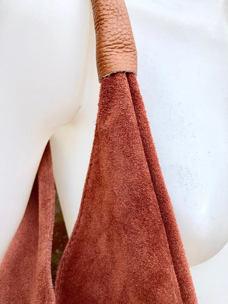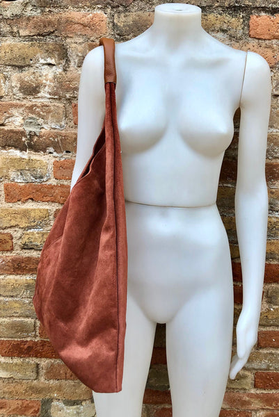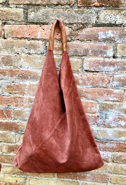 Slouch leather bag in terracotta suede .Genuine leather large shoulder bag. Dark orange - brown origami bag. Terracotta suede purse