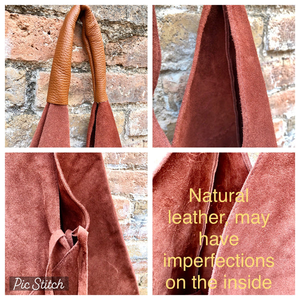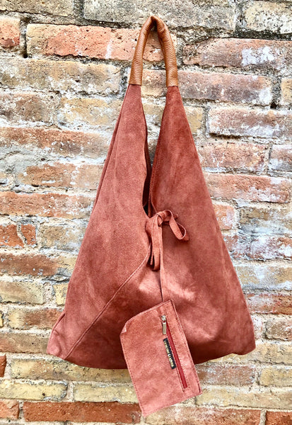 Origami style genuine suede leather bag in terracotta brown with camel brown leaather accent. LARGE tote leather bag in dark orange - brown . Slouch bag in genuine SUEDE leather. NOT LINED. We added a small leather zipper pouch for your mobile phone and/or cards or money. It ist attached to the inside of the bag with a piece of suede in the same green color. Genuine leather accent shoulder piece in camel brown.