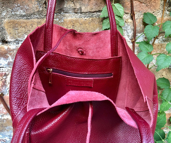 Large tote leather bag in BURGUNDY. Dark red color shoulder bag. Natural GENUINE leather. Large enough for books or a laptop, tablet, cosmetics bag etc.