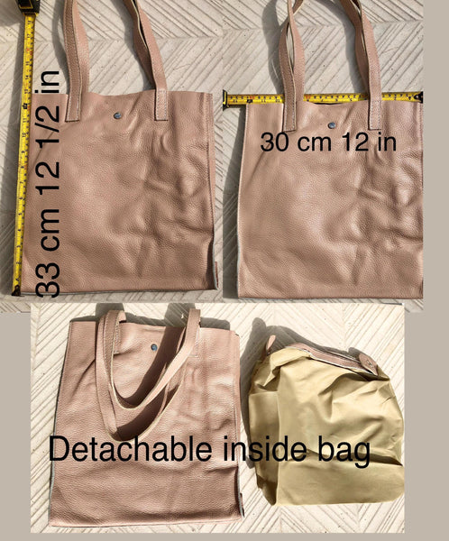 With a detachable inside bag, closed with a zipper. The main bag is closed with a magnetic snap at the center. You can easily carry your books, laptop or tablet in one nice bag , made of soft suede leather