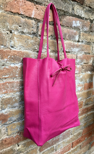 Large tote leather bag in HOT PINK. Vibrant fuchsia color shoulder bag. Natural GENUINE leather. Large enough for books or a laptop, tablet, cosmetics bag etc.