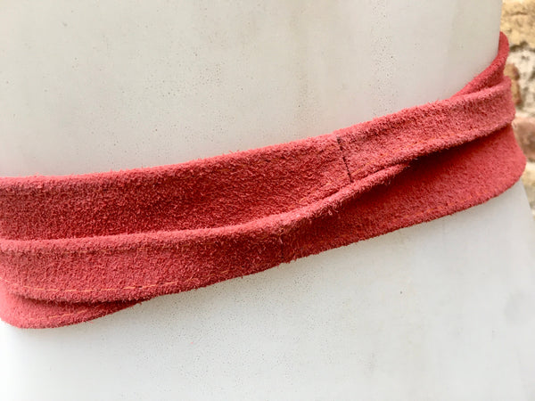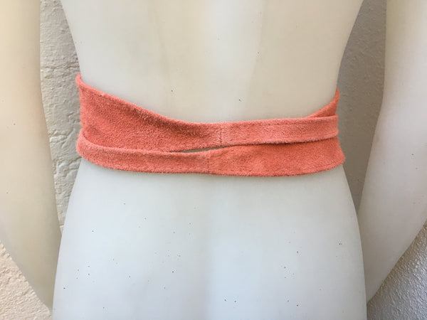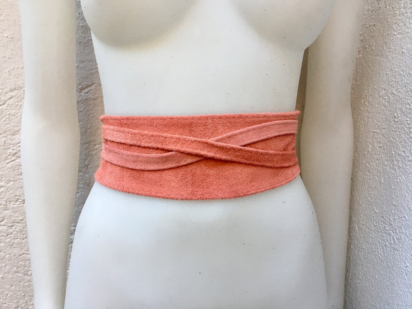 CORAL PINK suede sash. Leather OBI belt. Waist belt in soft natural genuine suede leather. Wraparound belt in a very light coral color.