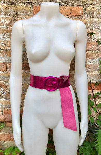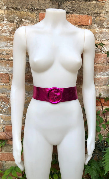 HOT PINK color belt in metallic effect GENUINE leather. Large round metallic buckle in FUCHSIA PINK