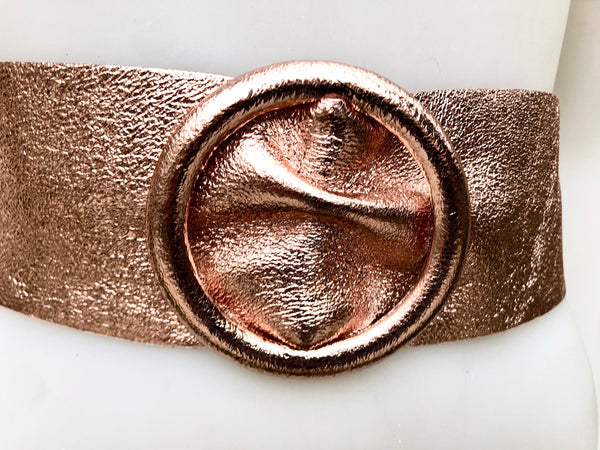Pink GOLD color belt in metallic effect GENUINE leather. Large round metallic buckle in pinkGOLD