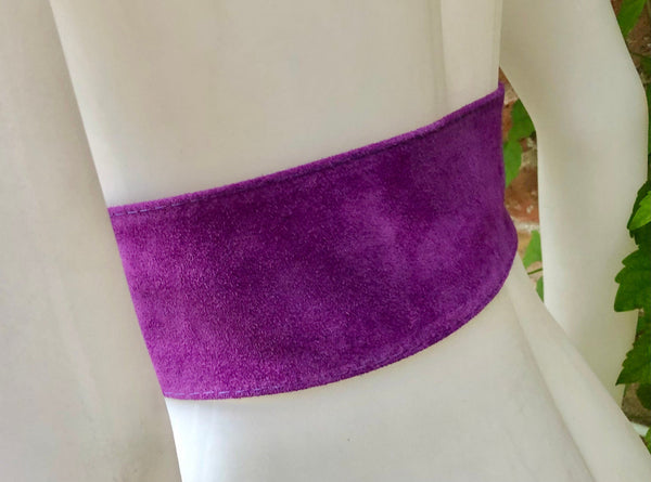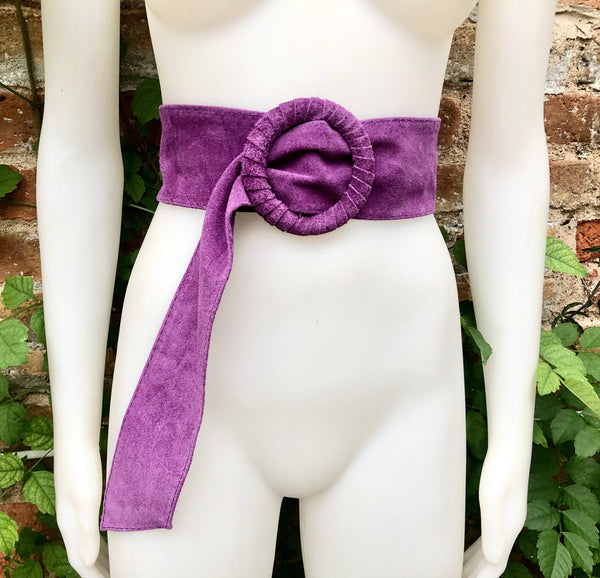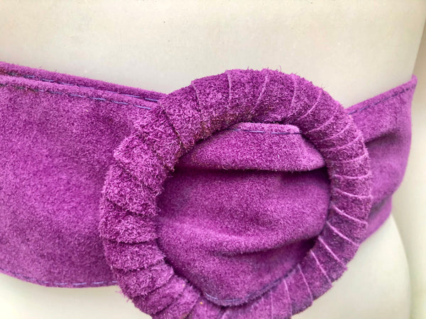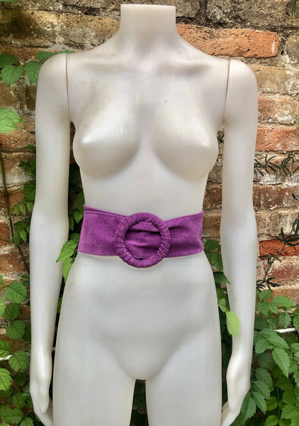 Purple belt in soft genuine suede leather. Large round buckle, covered in the same color suede.
