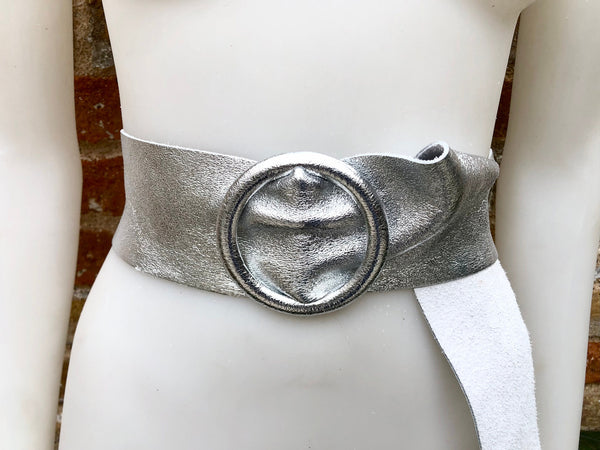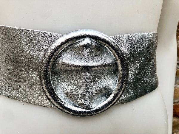 SIVER color belt in metallic effect GENUINE leather. Large round metallic buckle in SILVER