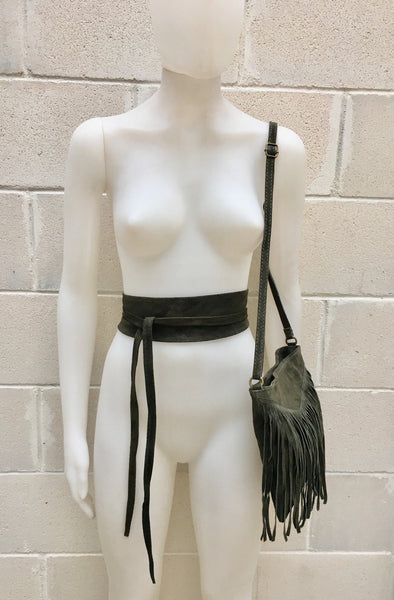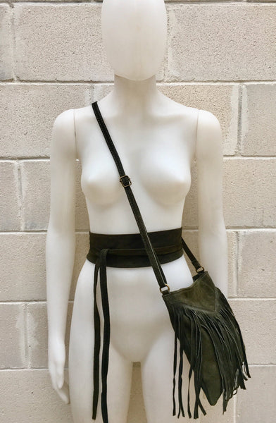 Cross body bag. BOHO suede leather bag in dark GREEN with FRINGES and suede waistbelt.Hippy suede bag and belt set in forest green