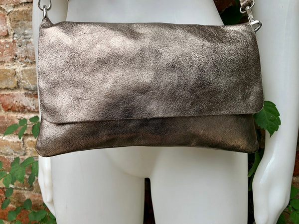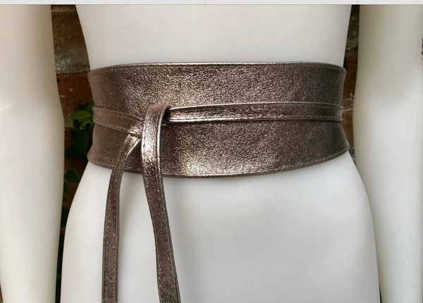 Small leather bag and matching obi belt in shiny metallic effect leather in a beautiful bronze shade . Natural GENUINE leather.
