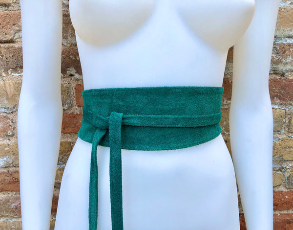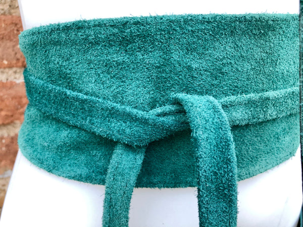 Small suede leather bag and matching OBI belt in teal GREEN. Natural, soft genuine suede leather in a beautiful dark blue-GREEN shade .Small cross body bag in suede. BOHO, Festival cross over bag. Adjustable and removable suede strap. Can be worn as a shoulder bag or cross body.
