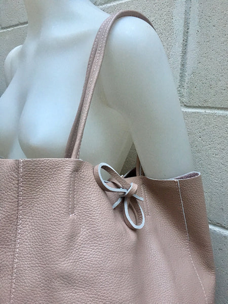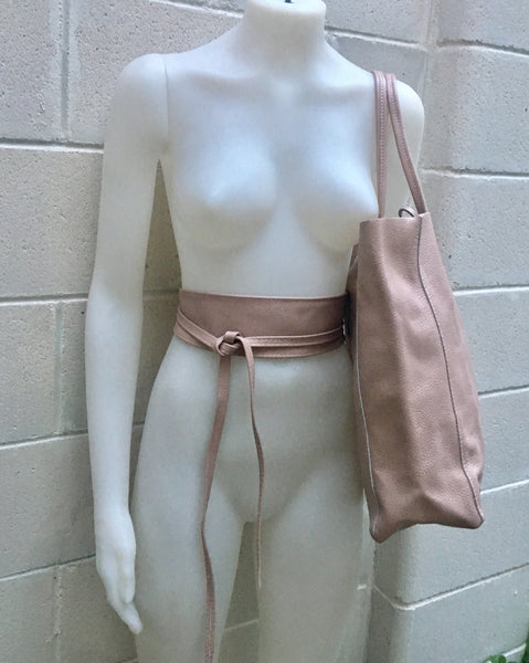 Large tote leather bag in SOFT PINK with matching belt. Natural GENUINE leather bag and belt set.