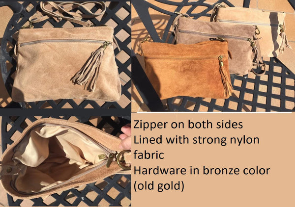 Crossbody suede leather bag in l CAMEL BROWN with tassel . Natural soft genuine leather. Cross over bag with adjustable strap, closed by zipper.