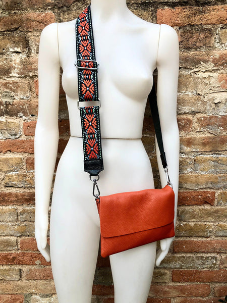 Orange small leather bag. 2 straps: 1 leather + 1 guitar strap. GENUINE leather Crossbody / shoulder bag. Orange purse with flap and zipper