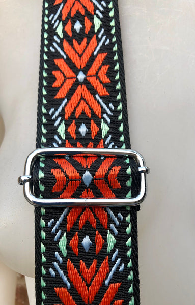 Leather bag in orange with 2 different adjustable and removable straps, one in leather and a beautiful guitar strap in black, blue and orange. Soft genuine leather. Small cross body bag in soft but strong leather. BOHO, Festival cross over bag..Closed by a zipper and also a leather flap.