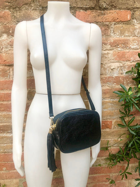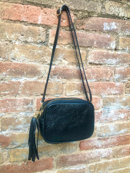 Leather bag in black. Genuine leather with a metallic shine effect. Small cross body bag in soft but strong leather. BOHO cross over bag. Closed with a zipper at the top with decorative tassel in the same leather. The inside of the bag is lined in a strong nylon-cotton mix fabric in BEIGE with a pocket inside. Adjustable strap. Fits regular and plus phones a wallet, keys and a small cosmetics bag