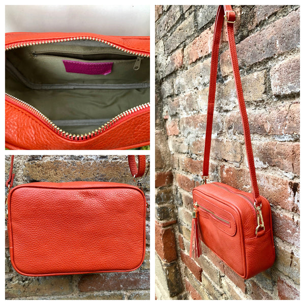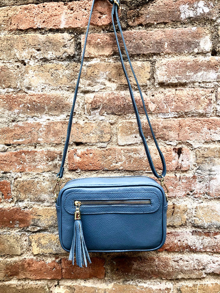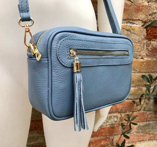 Small leather bag in BLUE. Cross body bag, shoulder bag in GENUINE leather. BLUE bag with adjustable strap and zippers. Gold accents.