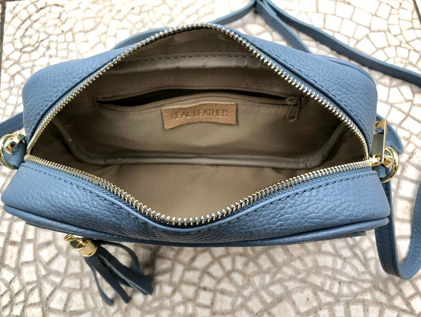 Leather bag in BLUE. Natural, soft genuine leather. Small cross body bag in soft but strong leather. Closed by a zipper at the top. Zipper closed pocket at the front. .The inside of the bag is lined in a strong nylon-cotton mix fabric eith a zipper closed pocket inside. Adjustable strap. Fits regular and plus phones a wallet, keys and a small cosmetics bag.