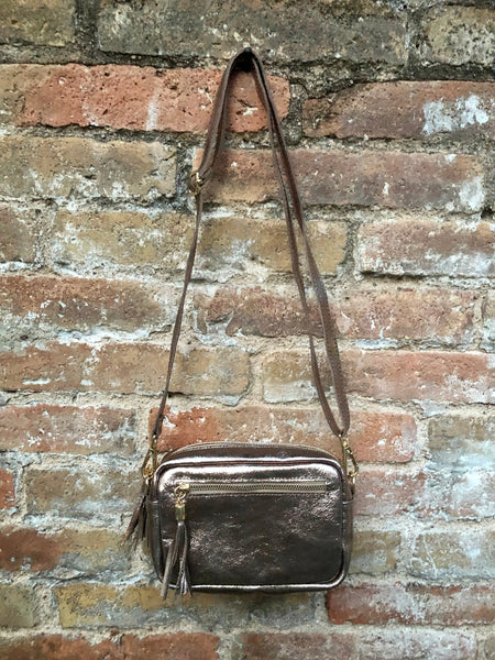 Leather bag in BRONZE. Natural, soft genuine leather. Small cross body bag in soft but strong leather. BOHO cross over bag. Closed with a zipper at the top with decorative tassel in the same leather. The inside of the bag is lined in a strong nylon-cotton mix fabric in BEIGE with a pocket inside. Adjustable strap. Fits regular and plus phones a wallet, keys and a small cosmetics bag