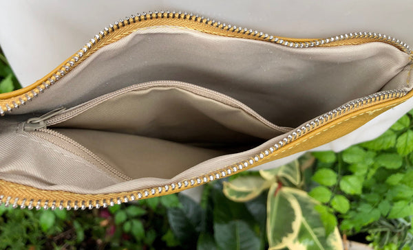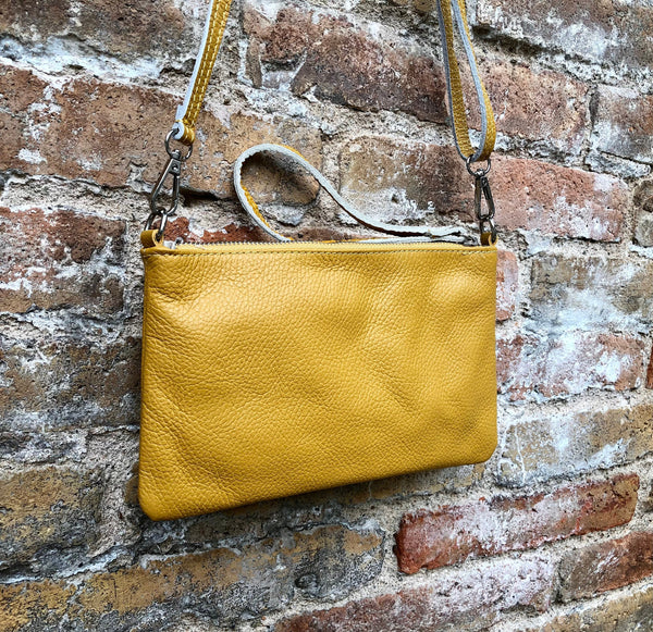 Leather bag in MUSTARD YELLOW . Natural, soft genuine leather. Small cross body bag in soft but strong leather. BOHO, Festival cross over bag. Closed by a zipper at the top and with a zipper closed pocket at the back of the bag.