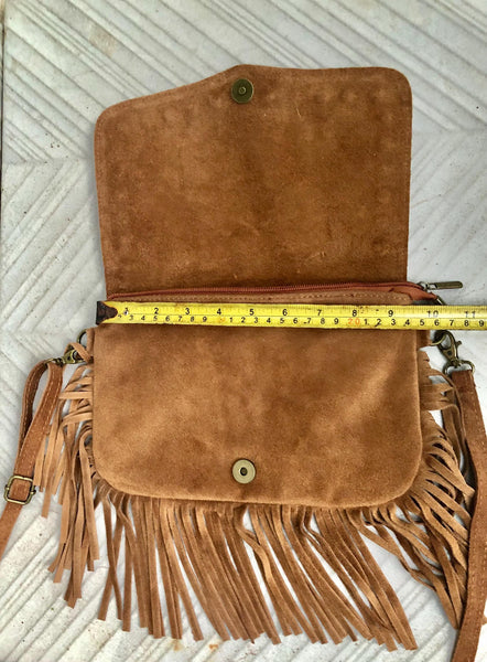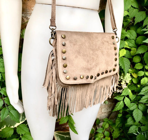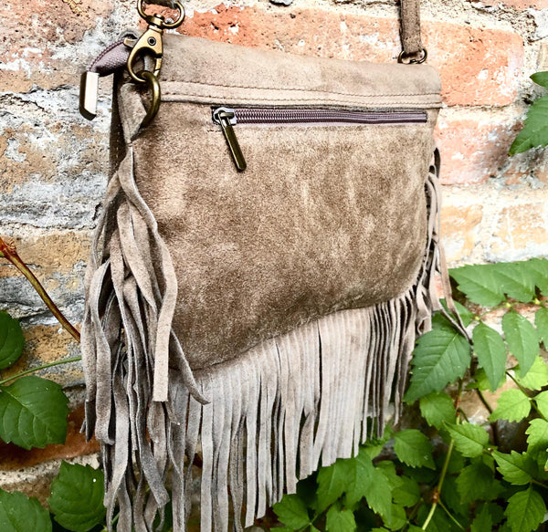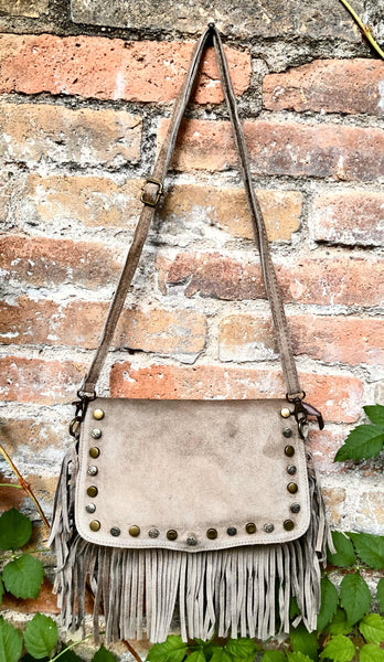 Taupe brown crossbody bag in suede leather with fringes and tacks in different designs. Greyge brown suede boho bag . Natural genuine suede leather. Hippy suede fringe bag.