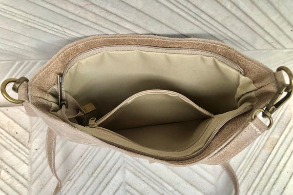 The bag is closed with a zipper on its upper part and also has an extra zipper closed pocket inside. Adjustable suede strap.