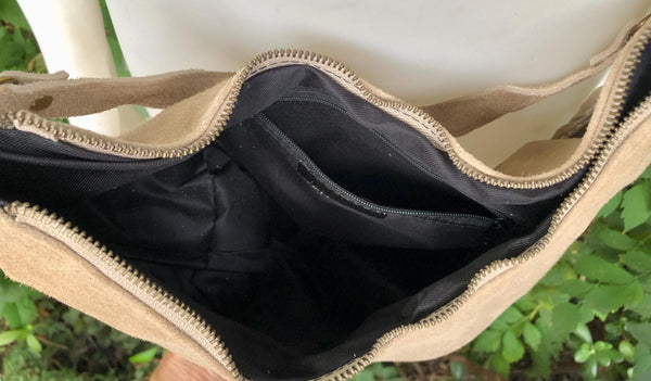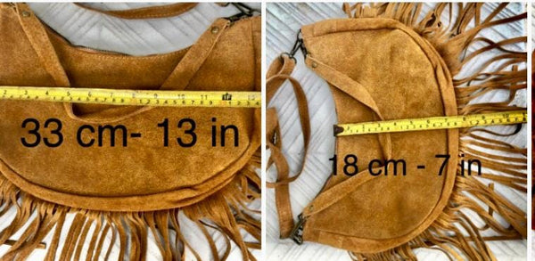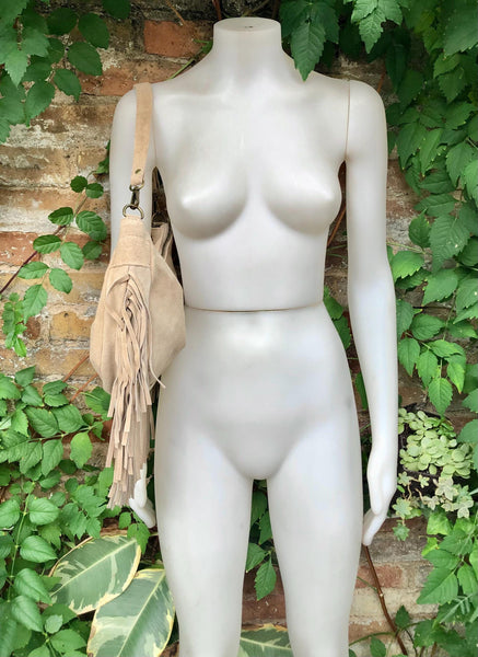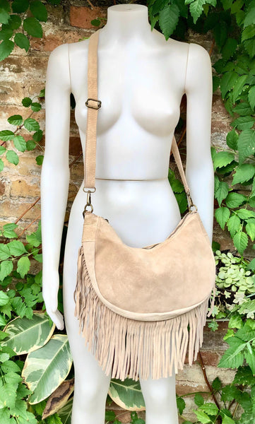 Beige crossbody bag in suede leather with fringes. Beige boho bag. Natural genuine suede leather. Messenger bag. Hippy bag with fringes.