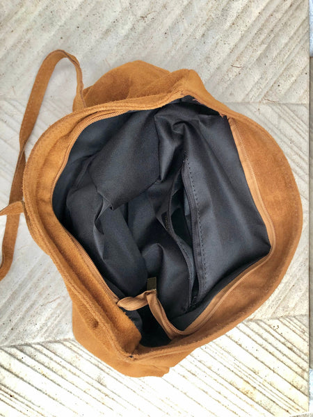 The inside of the bag is lined in a strong nylon fabric. We added a zipper closed pocket. Made with soft suede leather