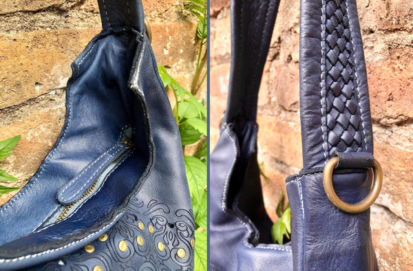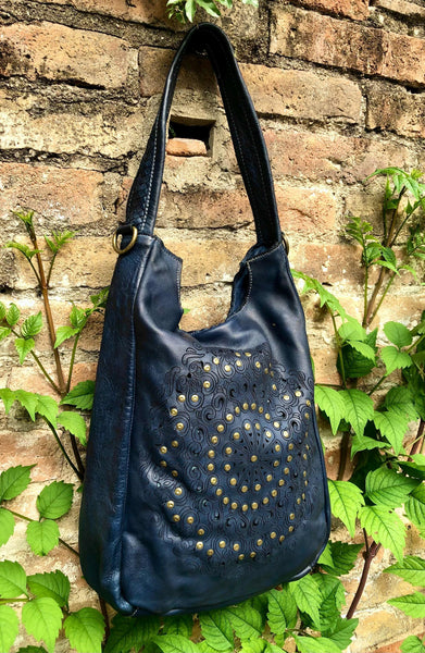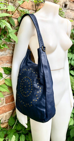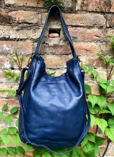 Genuine leather shopper bag in navy blue.