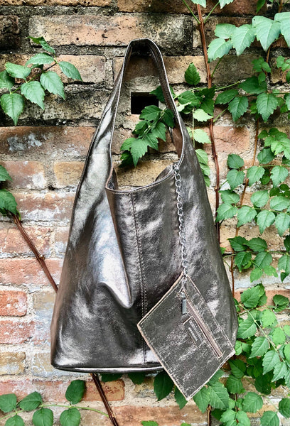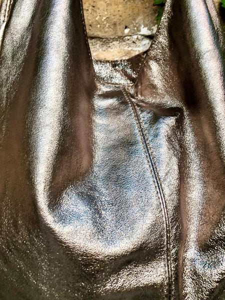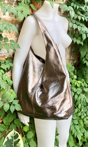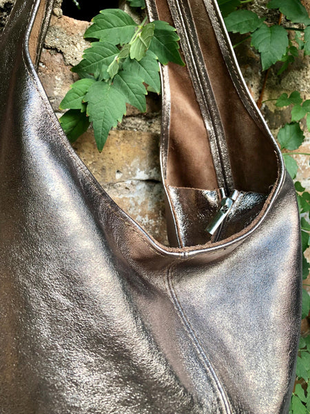 Slouch bag. Tote leather bag in BRONZE with ZIPPER.Soft natural glitter genuine leather. BRONZE leather purse. Metallic leather shoulder bag