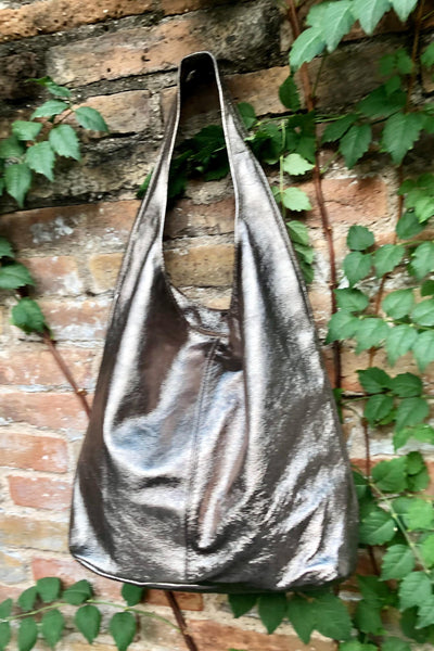 Tote leather bag in BRONZE with zipper. Natural genuine metallic finish leather. NOT LINED. This style is closed by a zipper. Bronze color laminated leather shoulder bag.