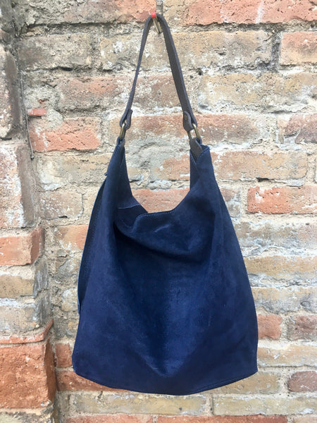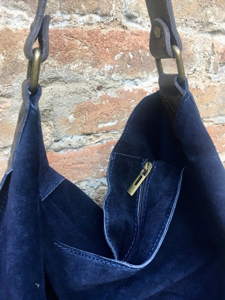 Hobo leather bag in Navy blue. Slouch bag in genuine SUEDE leather. This shoulder bag is NOT LINED. We added leather zipper pocket inside and a pouch for your mobile phone. Genuine strong but soft leather wide strap in brown.