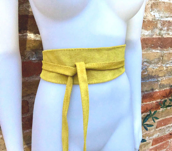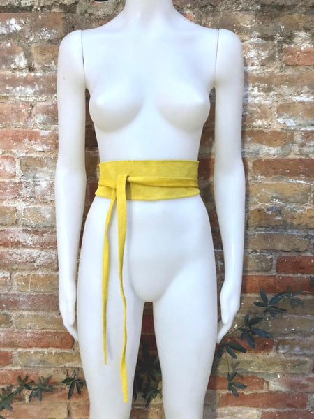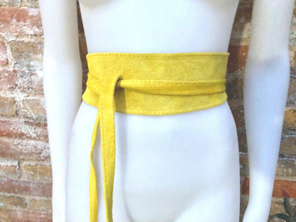 Obi belt in BRIGHT YELLOW suede leather. Wrap belt in soft natural suede. Genuine leather waist belt.