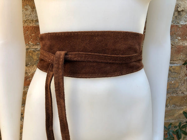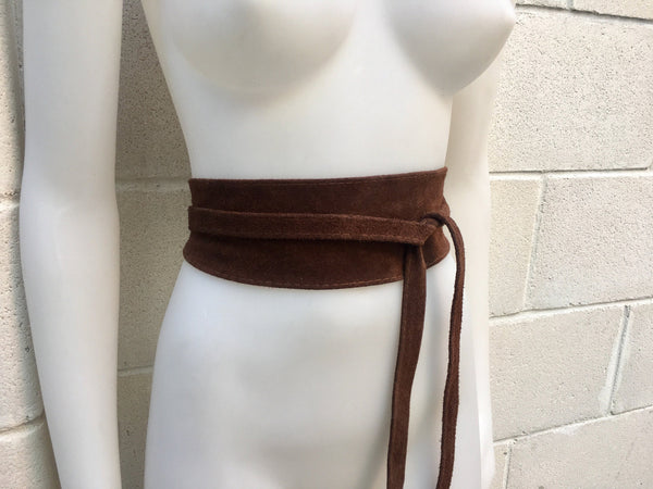 Chocolate brown OBI BELT in natural suede leather. Wrap belt in dark brown. Waist belt in soft natural suede leather. Brown color wraparound belt.