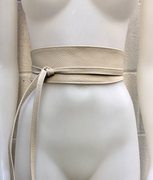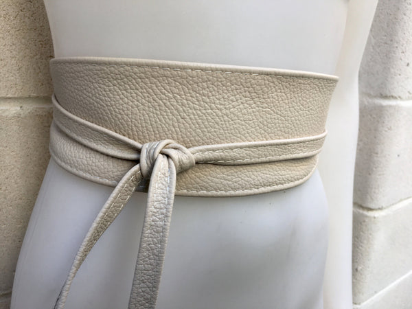 Cream obi belt in soft leather. Wrap belt in light beige. Wide waist belt in genuine leather. Genunine leather wraparound boho dress belt
