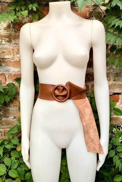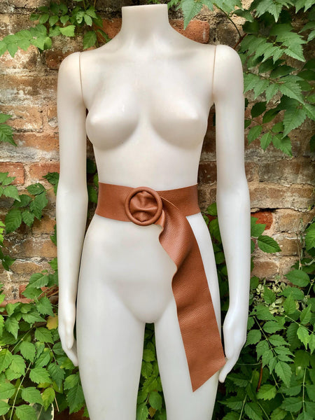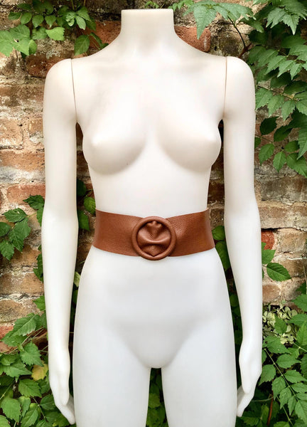 Dark camel brown leather waist belt with round buckle. Soft leather belt in camel brown. Genuine leather dress belt. Brown wide waist belt